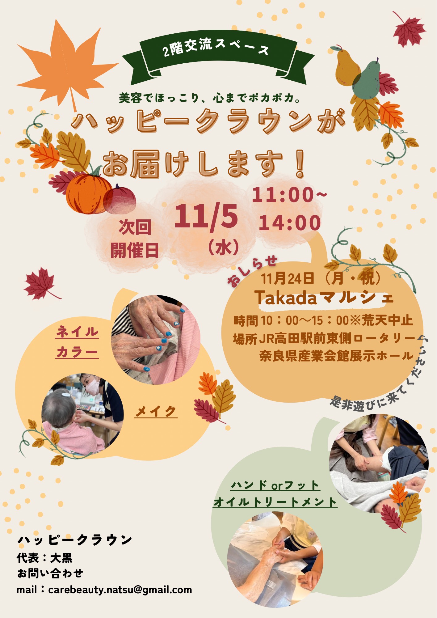 ハッピークラウン(介護美容) Tweet 更新日:2025年10月20日 イベント情報 活動場所 2階 交流スペース 開催日時 11月5日(水曜日)11:00~14:00 連絡先 carebeauty.natsu@gmail.com