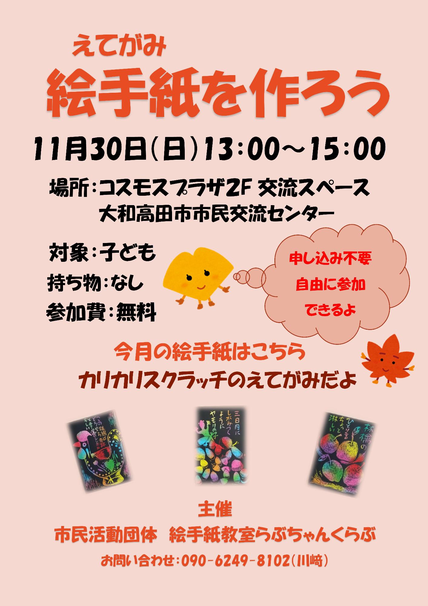 子どもの絵手紙教室(絵手紙教室らぶちゃんくらぶ) Tweet 更新日:2025年11月02日 子ども向け絵手紙教室 今月はスクラッチ絵手紙です。 参加費無料 イベント情報 活動場所 2階 交流スペース 開催日時 11月30日(日曜日)13:00~15:00 連絡先 090-6249-8102(かわさき)