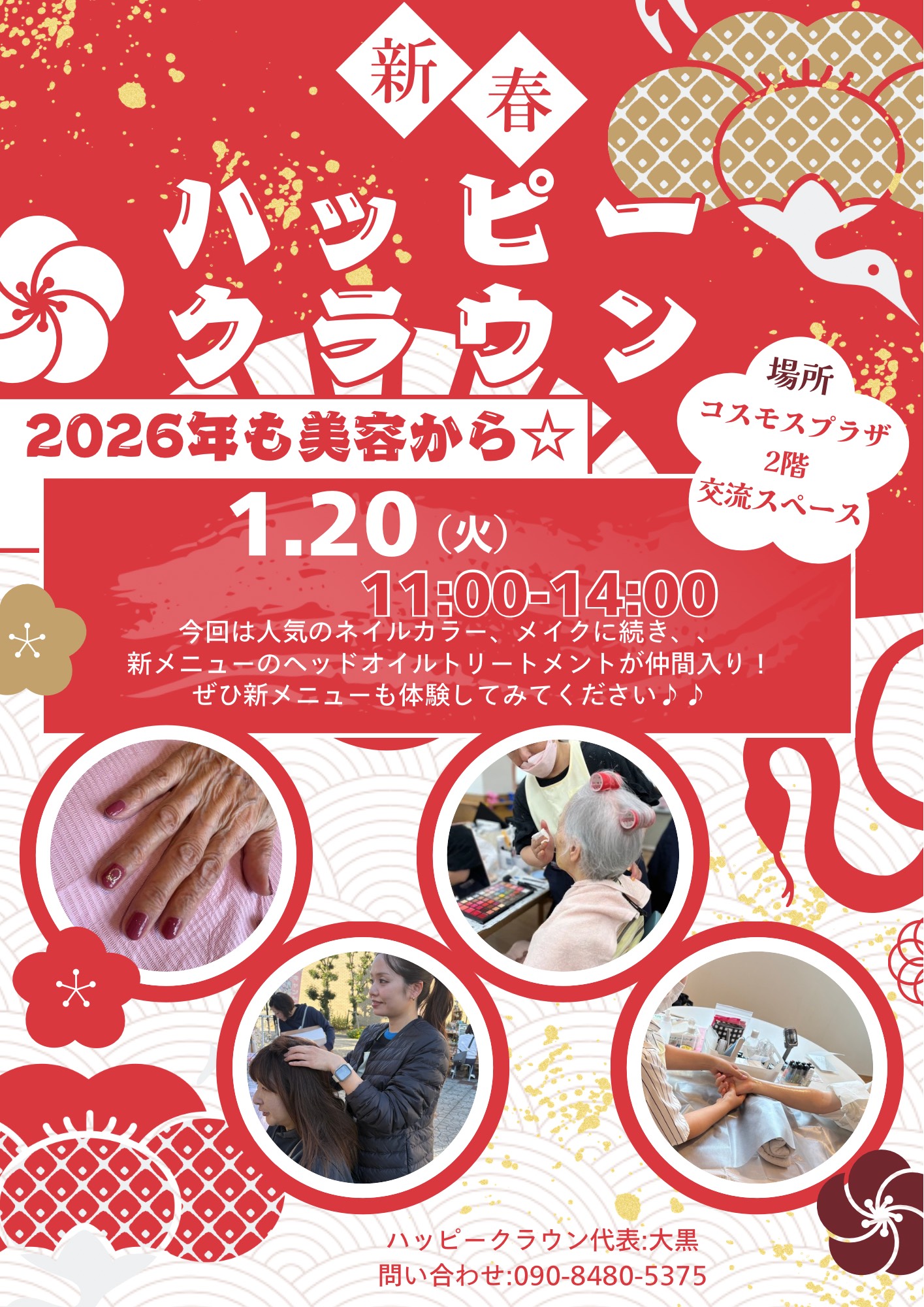 ハッピークラウン(介護美容) Tweet 更新日:2025年12月04日 イベント情報 活動場所 2階交流スペース 開催日時 1月20日(火曜日)11:00~14:00 連絡先 090-8480-5375(大黒)