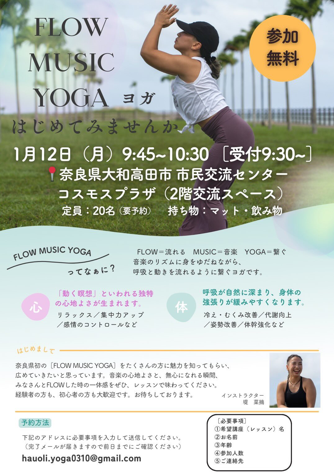 FLOW MUSIC YOGA Tweet 更新日:2025年12月08日 イベント情報 活動場所 2階交流スペース 開催日時 1月12日(月曜日)9:45~10:30 連絡先 hauoli.yoga0310@gmail.com