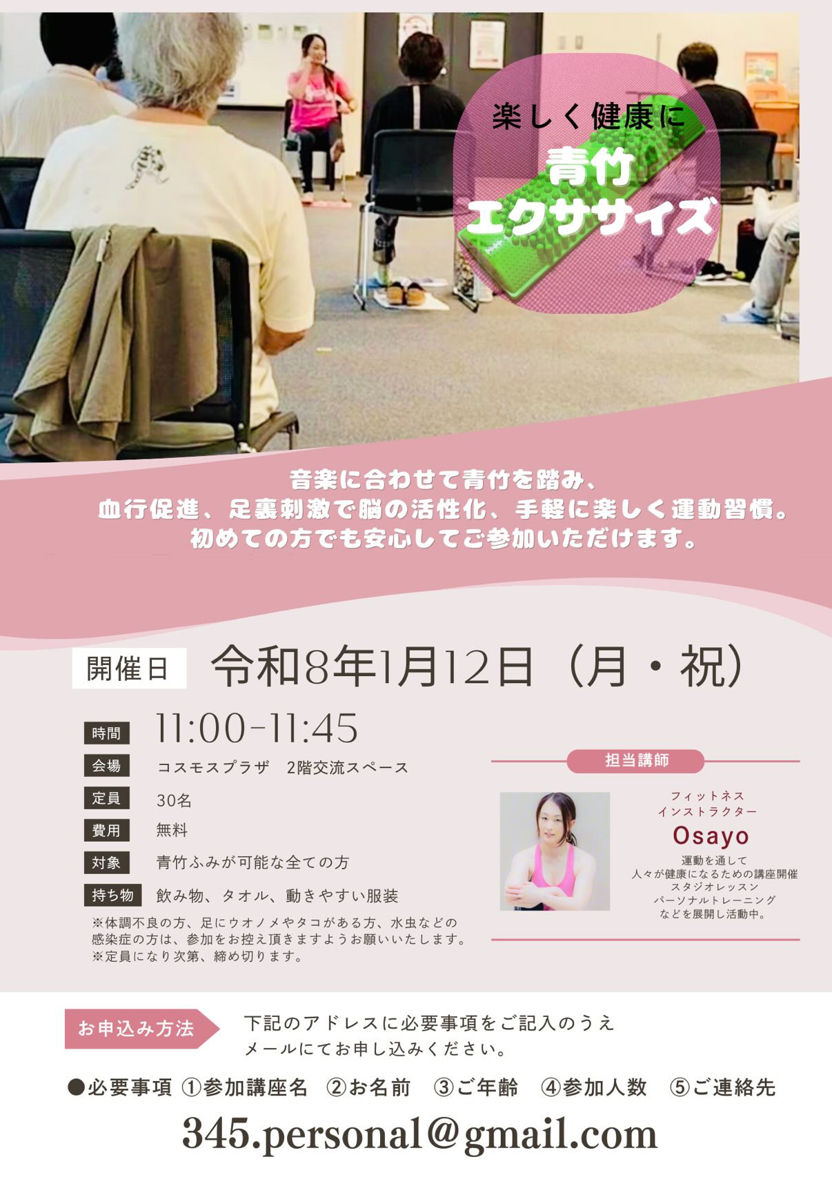 青竹エクササイズ Tweet 更新日:2025年12月08日 イベント情報 活動場所 2階交流スペース 開催日時 1月12日(月曜日・祝日)11:00~11:45 連絡先 345.personal@gmail.com
