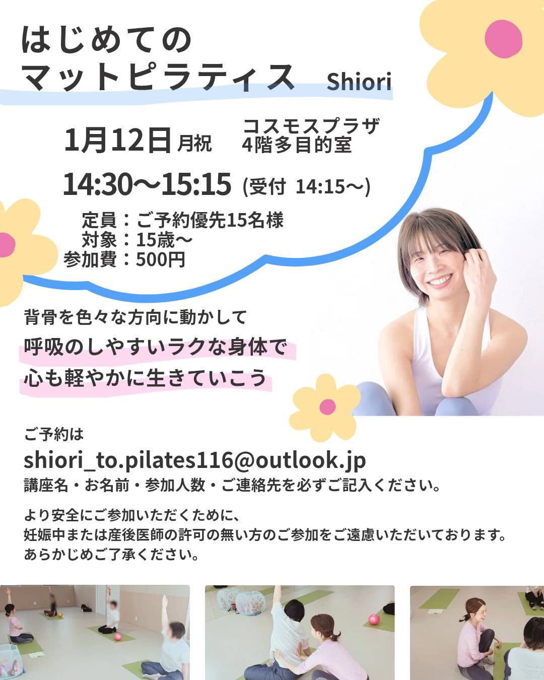 はじめてのマットピラティス Tweet 更新日:2025年12月08日 イベント情報 活動場所 4階多目的室 開催日時 1月12日(月曜日・祝日) 連絡先 shiori_to.pilates116@outlook.jp