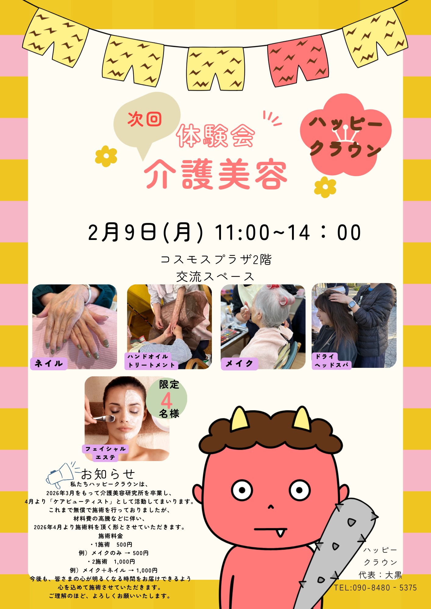 ハッピークラウン(介護美容) Tweet 更新日:2026年01月23日 イベント情報 活動場所 2階交流スペース 開催日時 2月9日(月曜日)11:00~14:00 連絡先 090-8480-5375(大黒 だいこく)