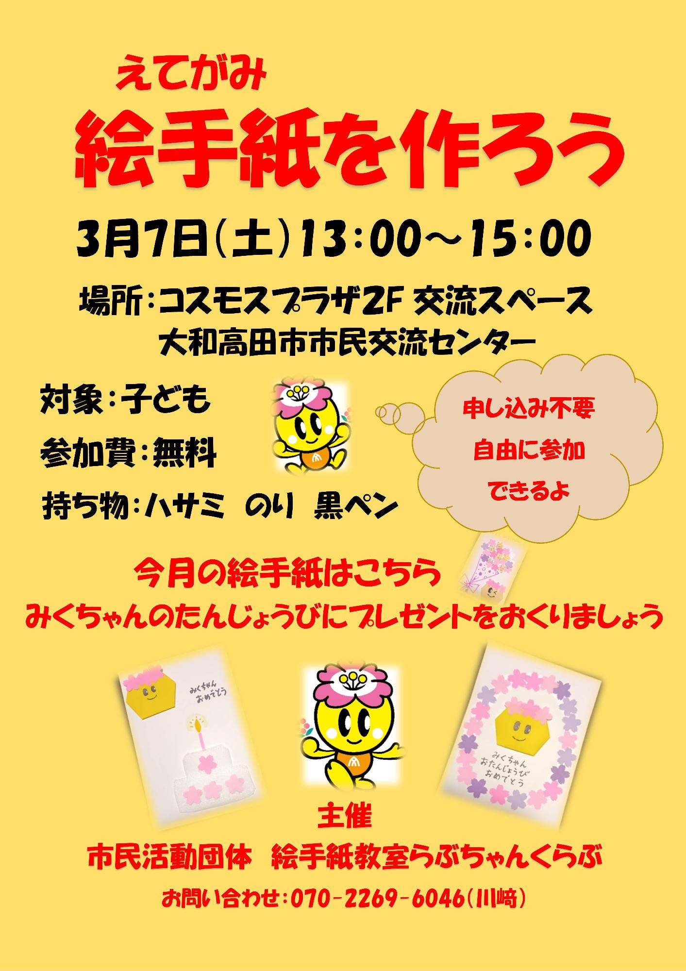 絵手紙教室らぶちゃんくらぶ子ども絵手紙教室 Tweet 更新日:2026年02月19日 イベント情報 活動場所 2階交流スペース 開催日時 3月7日(土曜日)13:00~15:00 連絡先 070-2269-6046(かわさき)
