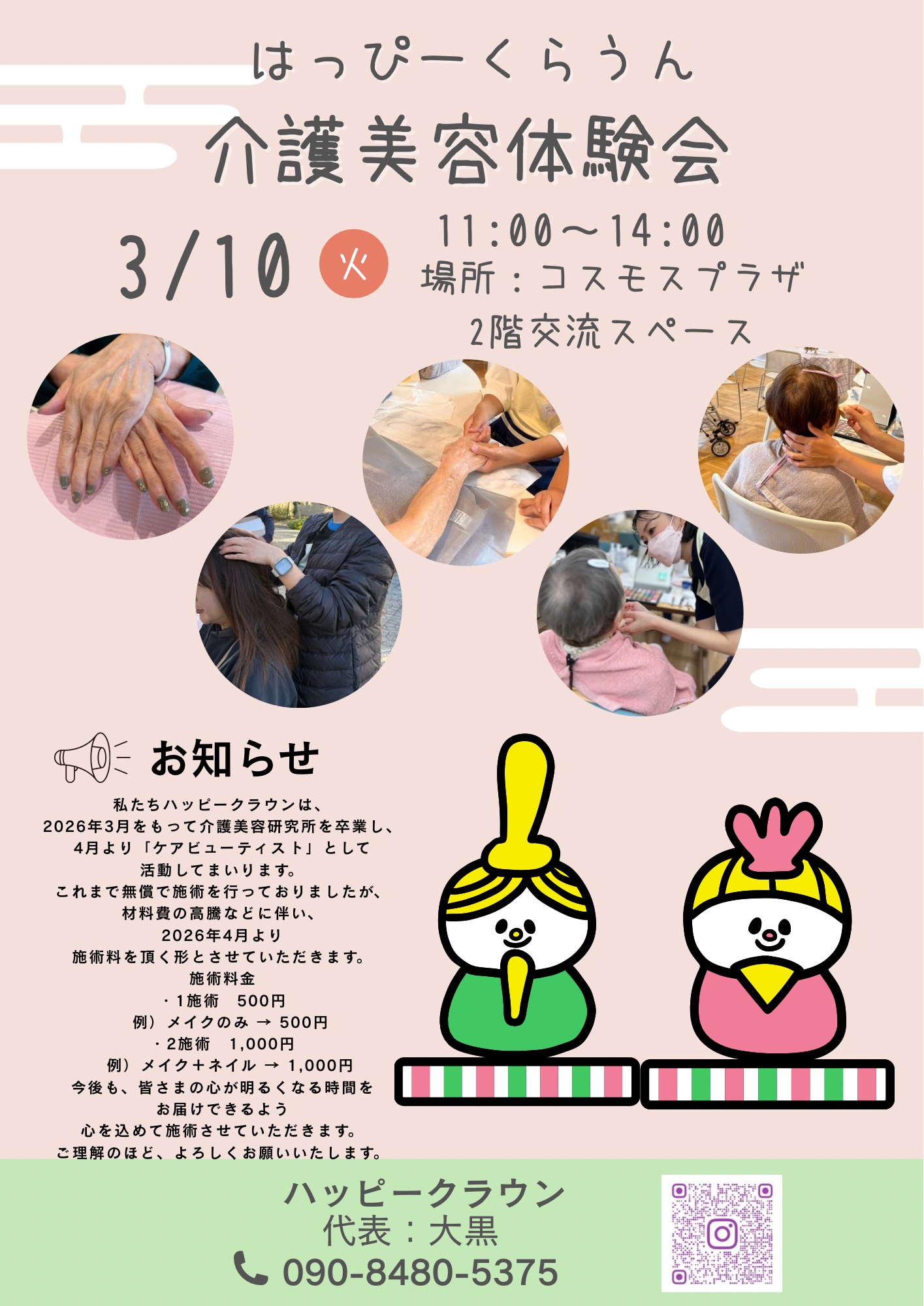 ハッピークラウン(介護美容) Tweet 更新日:2026年02月19日 イベント情報 活動場所 2階交流スペース 開催日時 3月10日(火曜日)11:00~14:00 連絡先 090-8480-5375(大黒)