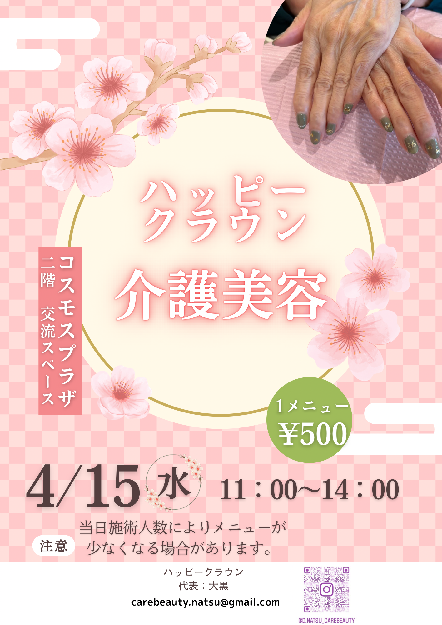 ハッピークラウン(介護美容) Tweet 更新日:2026年03月19日 4月より施術料(1メニュー500円)をいただきます。 イベント情報 活動場所 2階交流スペース 開催日時 4月15日(水曜日)11:00~14:00 連絡先 090-8480-5375(大黒)