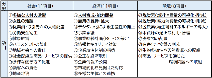(1)事業活動において、SDGs17ゴールに繋がる取組を、「社会」「経済」「環境」の3分野から、30項目を設定。