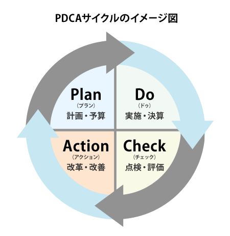 Plan(計画・予算) → Do(実施・決算) → Check(点検・評価) → Action(改革・改善)」を行政運営に取り入れ、行政がおこなっているサービスをその必要性や成果、効率性などの視点で客観的に評価し、改善につなげていくための道具であり、市民にとって「サービスを実施した結果どのような成果がもたらされたか」を示すための手法です。