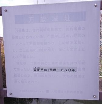 万歳氏は、古代葛城の氏族で、武内宿称(たけのうちすくね)の後裔(こうえい)といわれています。中世平田荘(ひらたのしょう)の八荘官(しょうかん)の一人として万歳郷を預かり、この城を本拠とし、二上山系に山城を構え、後に大和武士(やまとぶし)として活躍しました。 城址は、二重の廓(くるわ)と二重の環濠(かんごう)を持つ平城(ひらしろ)でありましたが、天正6(1578)年織田信長(おだのぶなが)の命(めい)で破却(はきゃく)されました。現在は高田西中学校南側道路沿いに説明版を残すのみです。