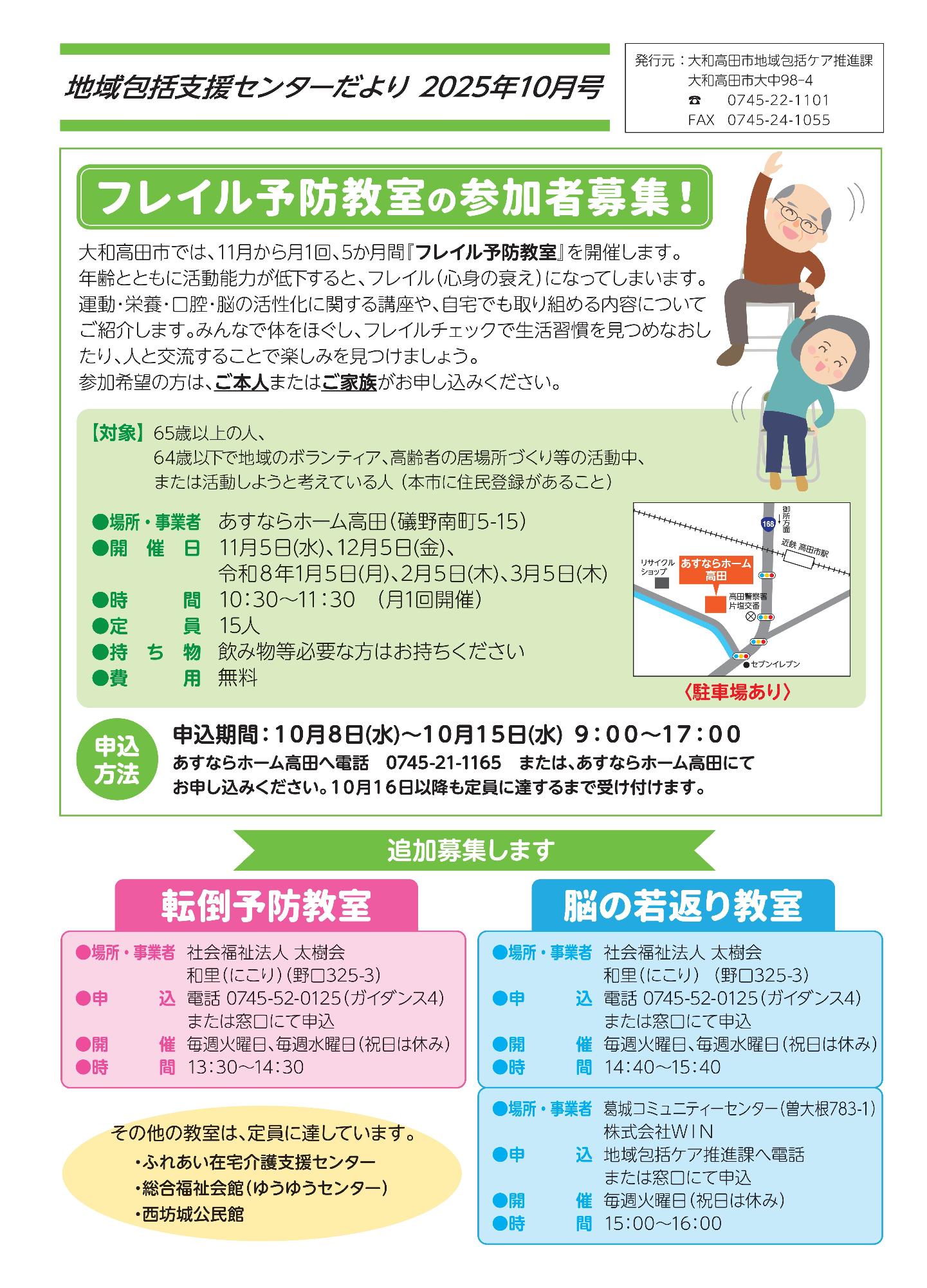 大和高田市では、運動や口の体操など、日常生活のなかで実践できる内容を楽しく学べる「フレイル予防教室」を開催します。教室では、専門の講師によるわかりやすい講座や簡単な体操などを楽しく学べます。