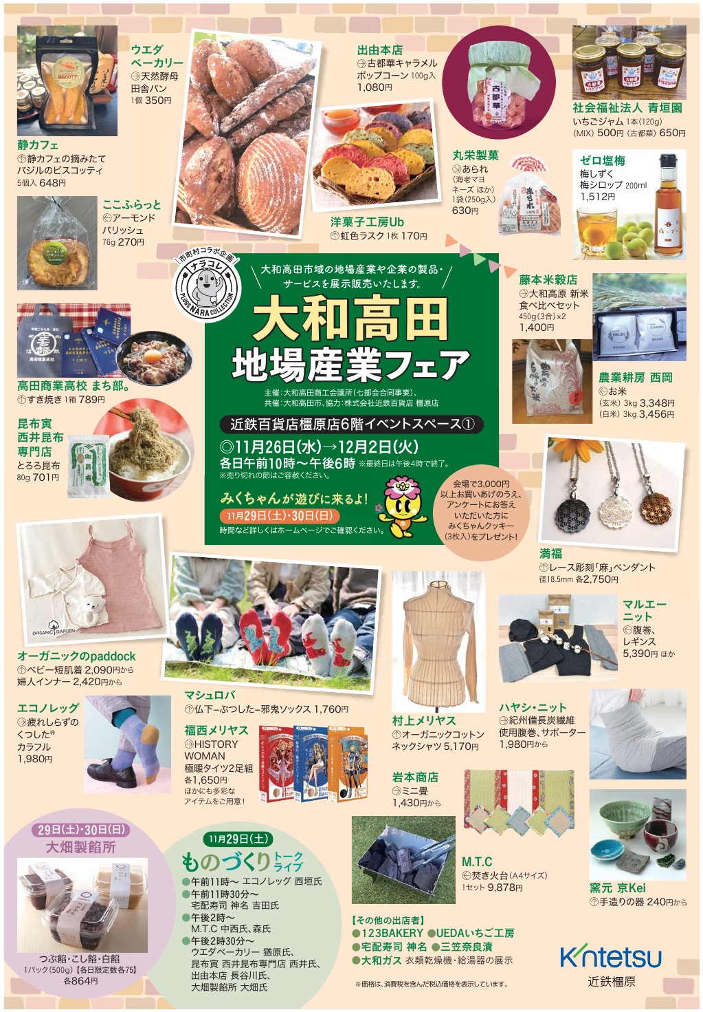 株式会社M.T.C/マシュロバ/神名(かむな)/エコノレッグ/オーガニックのpaddockパドック/株式会社丸栄製菓/ウエダベーカリー/村上メリヤス/藤本米穀店/株式会社マルエーニット/洋菓子工房Ub/三笠奈良漬/高田商業高校 まち部。/大畑製餡所/静カフェ/出由本店/昆布寅西井昆布専門店/株式会社ハヤシ・ニット/福西メリヤス株式会社/満福/社会福祉法人青垣園/大和ガス株式会社/窯元京kei/UEDAいちご工房株式会社/農業耕房 西岡/有限会社岩本商店/ゼロ塩梅/123 BAKERY/ここふらっと/奈良文化高校(申込順 全30ブース)