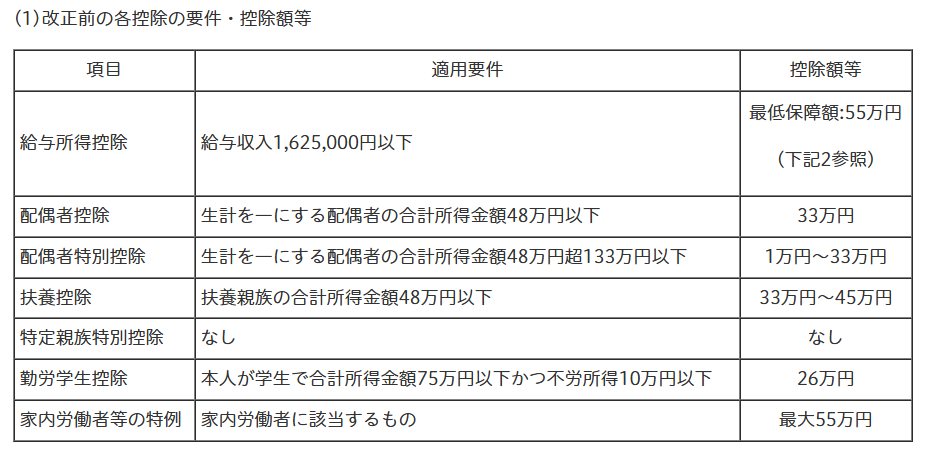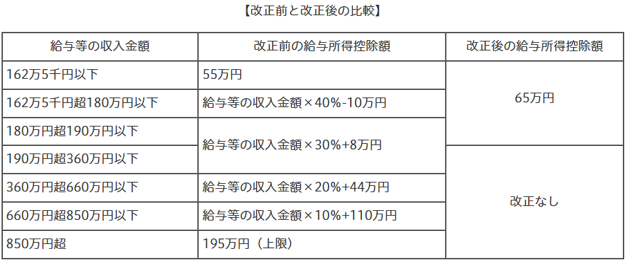 給与所得金額を計算する際の給与収入金額から差し引かれる給与所得控除の最低保障額が、55万円から65万円に10万円引き上げられます。