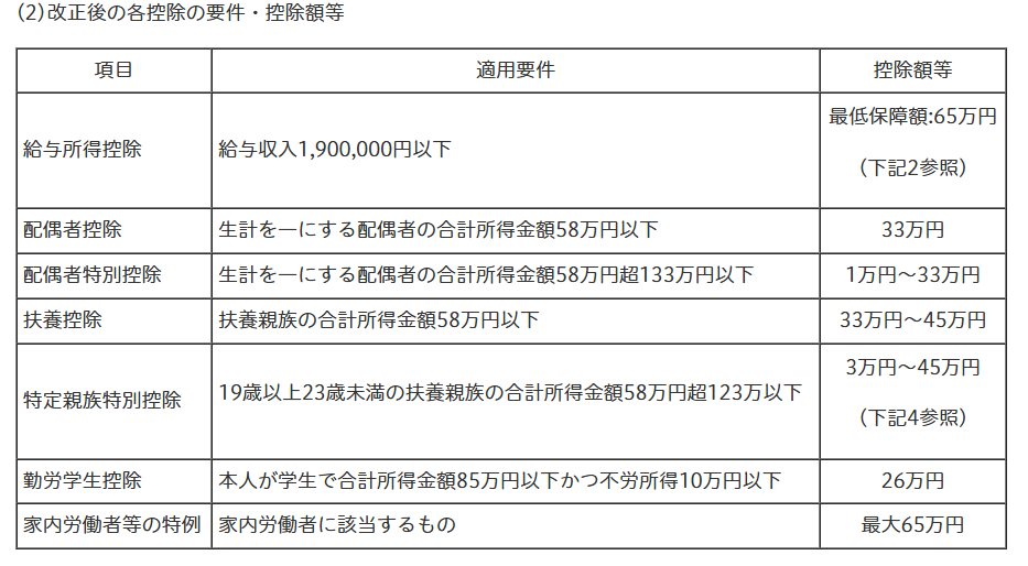※令和7年分以降の所得税で適用される「基礎控除」や「給与所得控除」に関する見直し、「特定親族特別控除」の創設については、右リンク先の国税庁ホームページ内の『令和7年分税制改正による所得税の基礎控除の見直し等について(外部サイトへリンク)』をご参照ください。