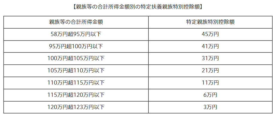 19歳以上23歳未満の者の内、合計所得金額が58万円を超え、扶養控除を適用できない者についても段階的に控除を受けられるようになります。適用される控除額は以下の表を参照してください。